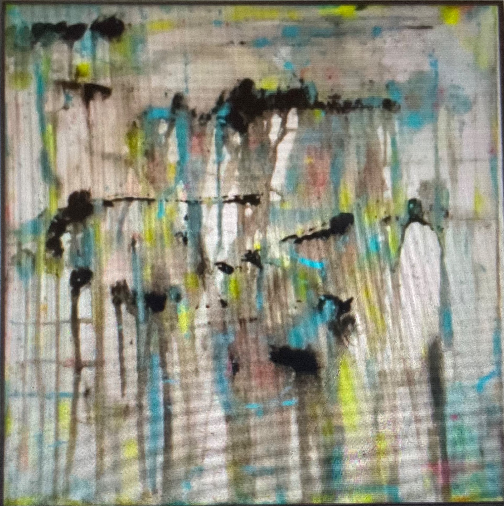 Static Rain Abstract painting acrylic on canvas. Size 45x45cm. £220.Description: Captures the quiet tension between movement and stillness.Soft grey washes fall like rain through layers of black marks hints of blue and yellow,evoking urban air charged with memory,noise, and fleeting emotion.