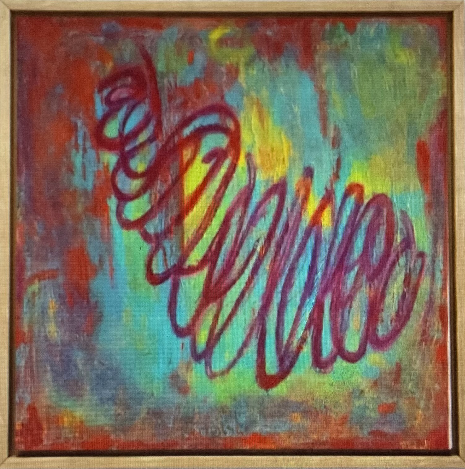 Inner Loop abstract painting acrylic and oil pastel on canvas. Size 45X45cm. £220.Description: Layered colour and looping marks suggest an inward rhythm-motion contained, emotion quietly circling.