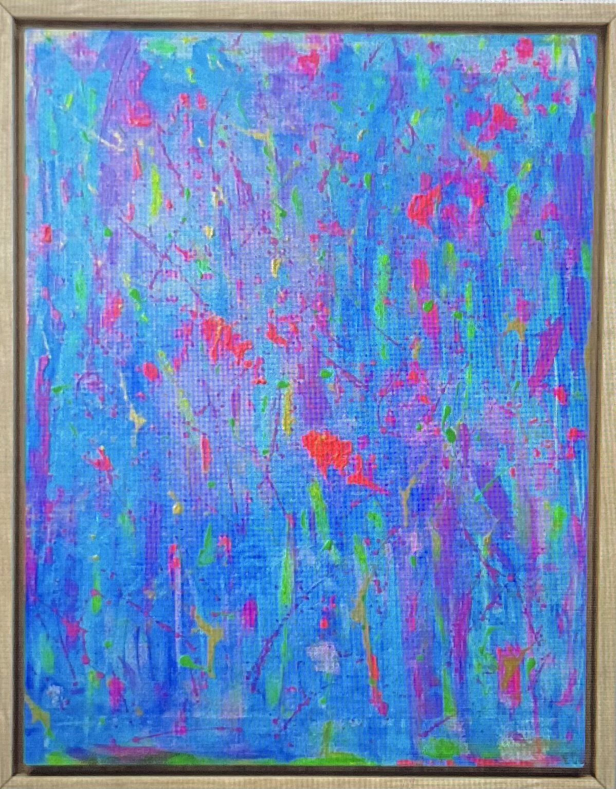Electric Bloom. Acrylic on canvas. Size 30x42cm.£210. Description: Expressive abstract in vivid pinks, blues, and purples. Layers of color and texture create a sense of energy.