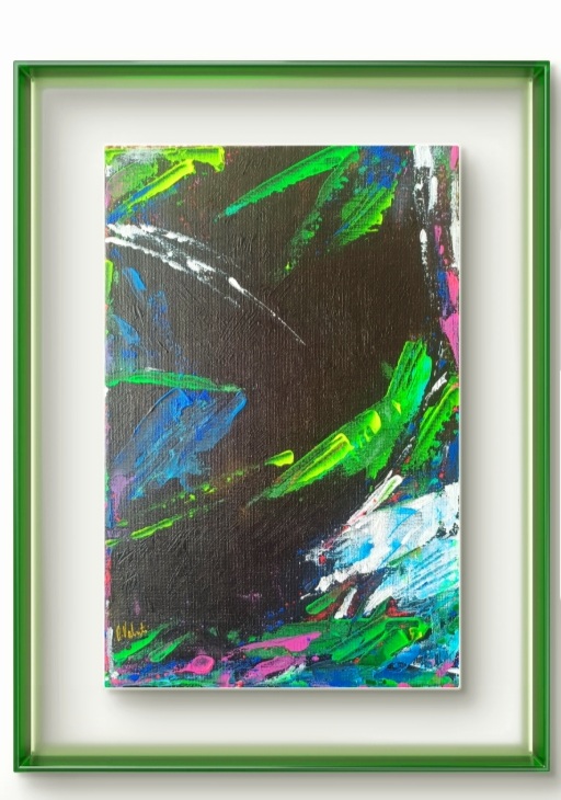 Verdant Drift Abstract acrylic painting on canvas . Size 20x30cm. £40. Description : Bold strokes of green, blue and pink surge across a dark,textured ground,suggesting movement at the edge of visibility. The composition balances tension and vitality,where flashes of white act as brief sparks of clarity within the flow.