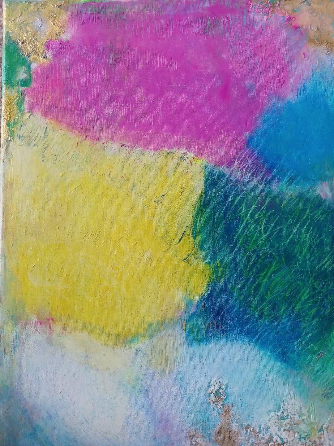 Chromatic Drift. Acrylic, oil sticks and gold leaf.Size29x39. £120.. Description: soft fields of colour gently collide,creating a quiet sense of movement-like emotions passing through each other without resistance.