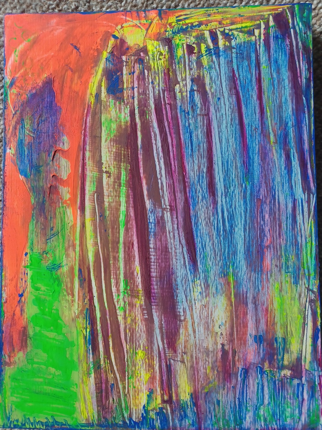 Veil of Becoming .Acrylic and oil sticks on wood panell. Size 23x30cm.£40. Description: Vertical washes of blue, violet and green, slide beneath a warm coral edge, suggesting layers of memory and movement.