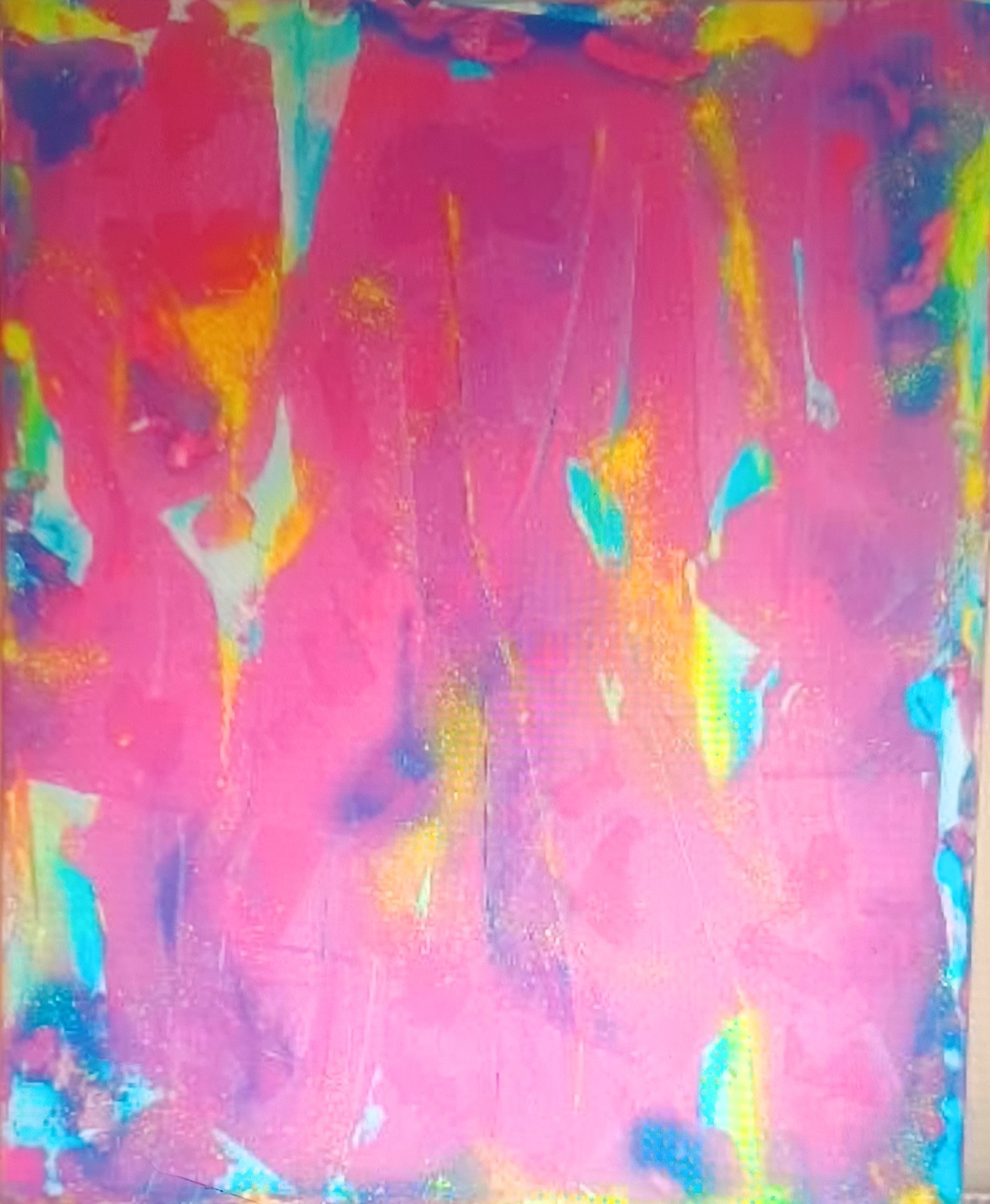 Luminous Chaos .Mixed media abstract painting acrylic and oil sticks on canvas. Size 60x 60cm.£ 340. Description . This abstract painting bursts with vibrant layers of fluorescent pink,red,yellow,and hints of turquoise.Textured vertical and horizontal strokes create a dynamic ,energetic composition.