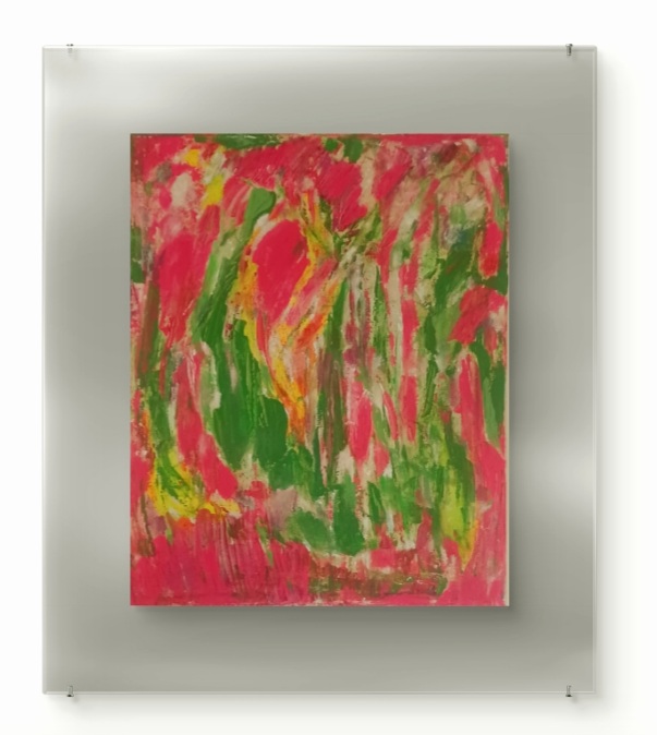 Spring Energy. Acrylic and oil sticks on canvas. Size 40x50cm.£300. Description: Vibrant abstract composition ,bold pinks and greens create dynamic movement and tactile texture, evoking the energy of a new growth.